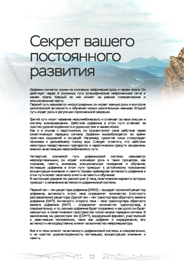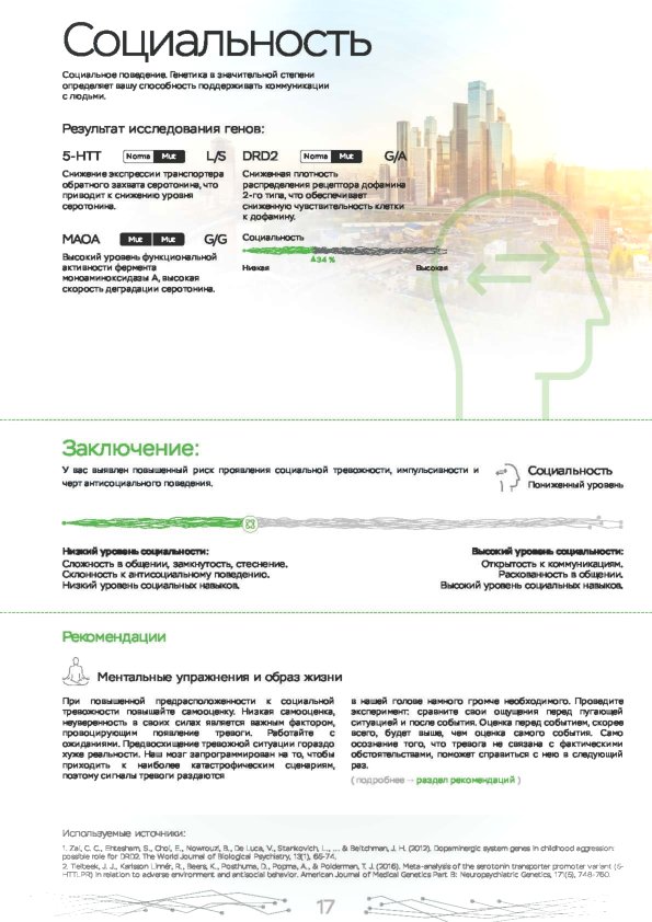 Этот ДНК анализ показывает влияние наиболее важных 10 генов на психическое и эмоциональное состояние. Именно они регулируют выработку гормонов, работу нейромедиаторов. Используйте знания о природных свойствах своего организма для борьбы со стрессом, повышения работоспособности и общего тонуса. Каждый человек индивидуален, поэтому мы рекомендуем пройти наш генетический нейро тест в Сухиничах.